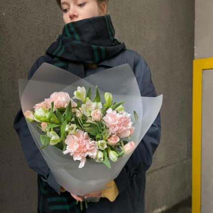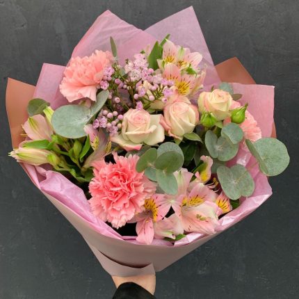 Букет с амариллисом, антуриумом, кустовыми розами, гвоздикой и эвкалиптом “Kenzo lux”
