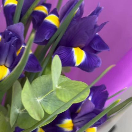 Букет-комплимент с ирисами, розой, альстромерией, ваксфлауэром( вереском) с эвкалиптом