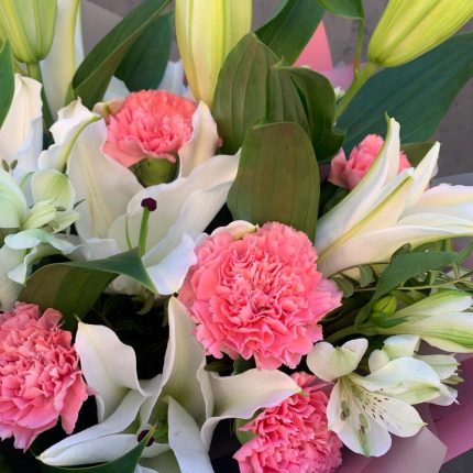 Букет из лилии, хлопка, эустомы, роз, диантусов, ирисов, кустовой хризантемы и самшита в стильной упаковке “Джун Осборн”