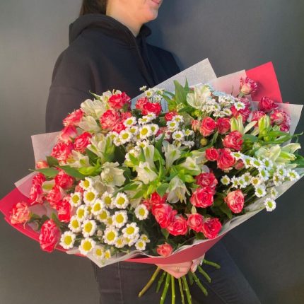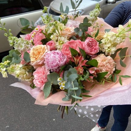 Солнце в руках, букет с ранункулюсами, ромашками и пионовидными розами
