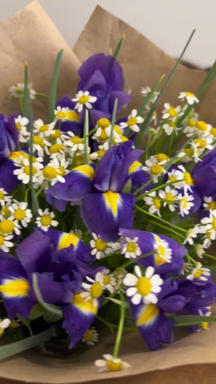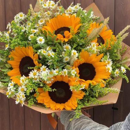 Букет из подсолнухов, ромашек, солидаги, триникума и зелени Летнее танго