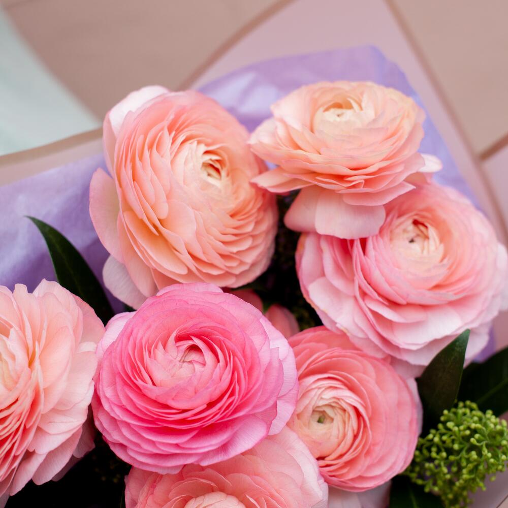 Ранункулюс розовый – 9 шт.Скиммия – 4 шт.Упаковка дизайнерская – 1 шт.