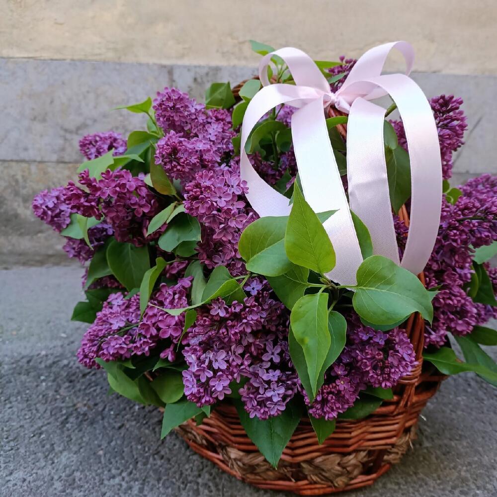 Сирень – 11 шт.Лента атласная – 1 шт.Корзина плетеная – 1 шт.Пленка матовая – 1 шт.Оазис флористический – 2 шт.
