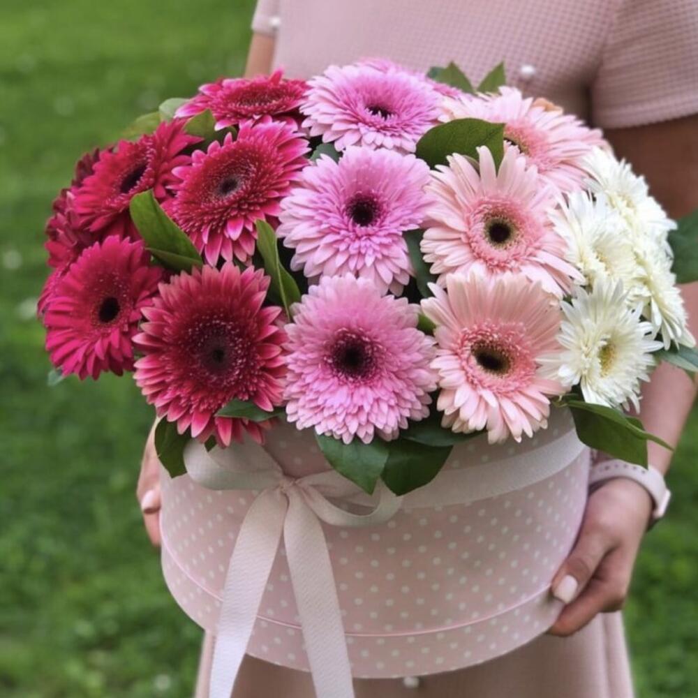 гербера крупная – 25 шт.шляпная коробка в ассортименте – 1 шт.Оазис флористический – 2 шт.