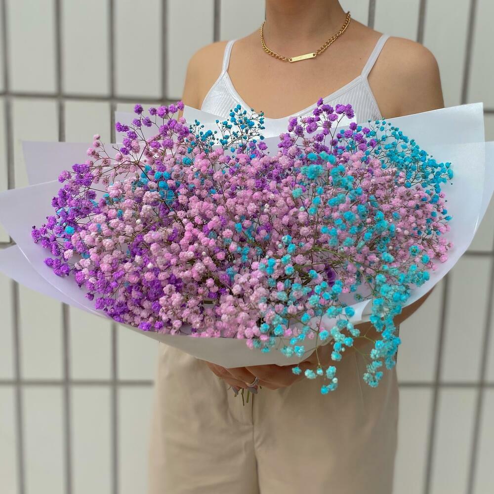 Гипсофила розовая – 3 шт.Гипсофила фиолетовая – 3 шт.Гипсофила голубая – 3 шт.Пленка – 2 шт.Лента – 1 шт.