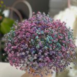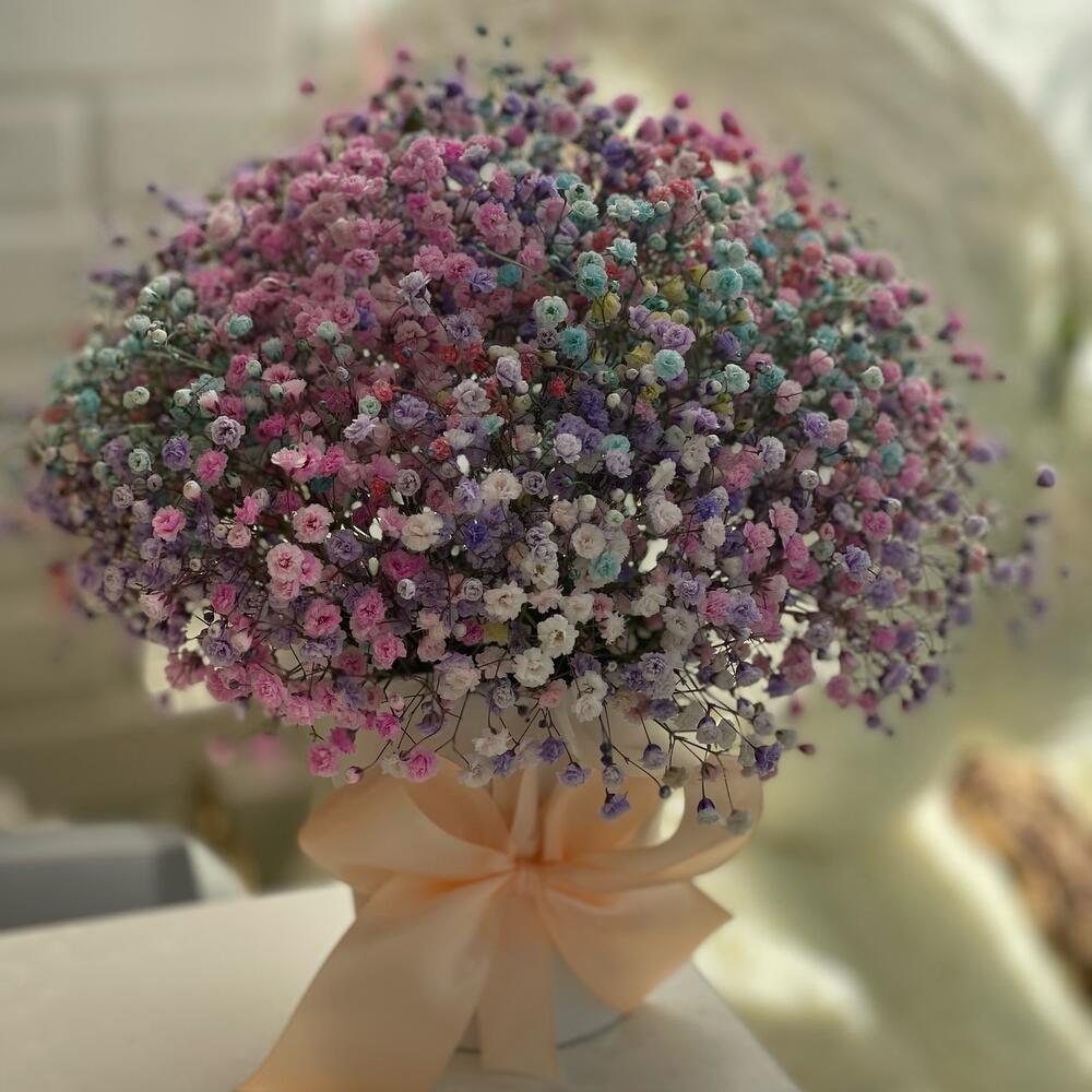 “Сиреневый туман” – композиция из гипсофилы в шляпной коробке