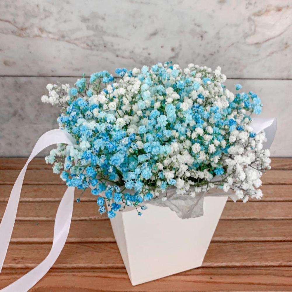 Очаровательная, воздушная композиция из гипсофилы, в коробочке сумочка .Цветы стоят в специальной флористической губке,что позволяет им больше оставаться свежими и радовать получателя. Так же композиция в коробке это очень удобно и эффектно, так как не надо ставить букет в вазу и менять воду. Необходимо лишь подливать в губку воду.Инструкция по уходу за цветами прикреплена к каждому заказу.Цветы гипсофилы отличаются стойкостью и даже при высыхании не теряют, декоративности и цвета. Что позволяет, долгое время украшать интерьер в качестве сухоцветов.Подпишем открытку с вашими пожеланиями бесплатно