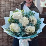 Гортензия – 5 шт. Гипсофила – 5 шт. Фисташка – 10 шт. Упаковка дизайнерская – 8 шт. Лента – 1 шт.