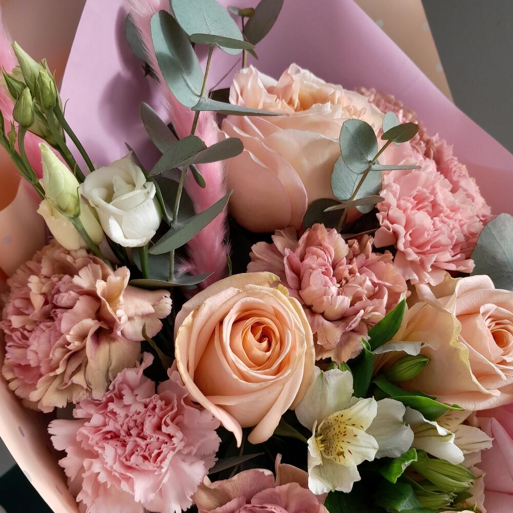 Категории: АльстромерииРозы, Гвоздики, Лизиантусы