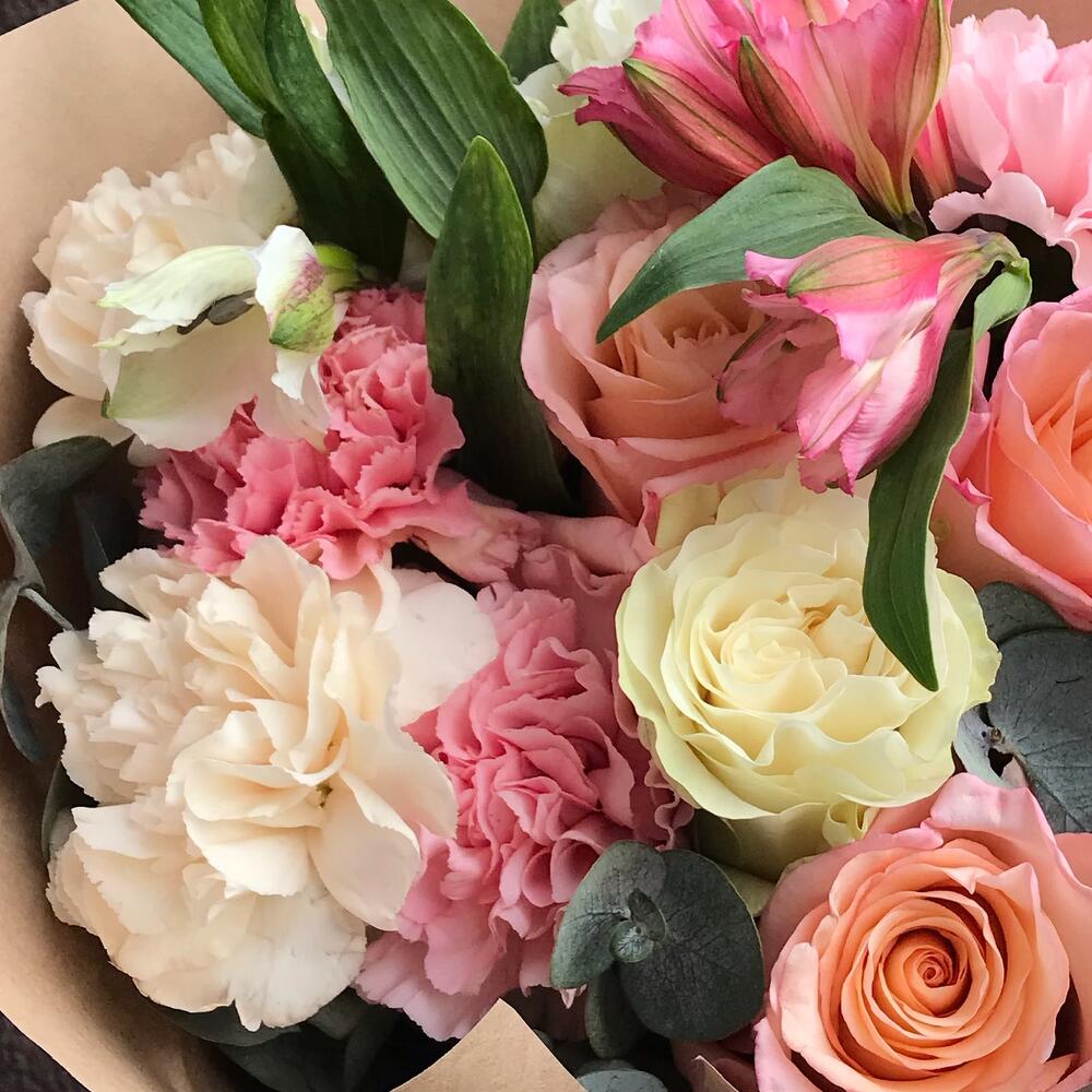 Роза Эквадор – 5 шт.Диантус сортовой – 5 шт.Альстромерия Микс Европа – 2 шт.Эвкалипт – 1 шт.Упаковка крафт – 1 шт.бечевка натуральная – 1 шт.Лента атласная – 1 шт.Прищепка декор – 1 шт.