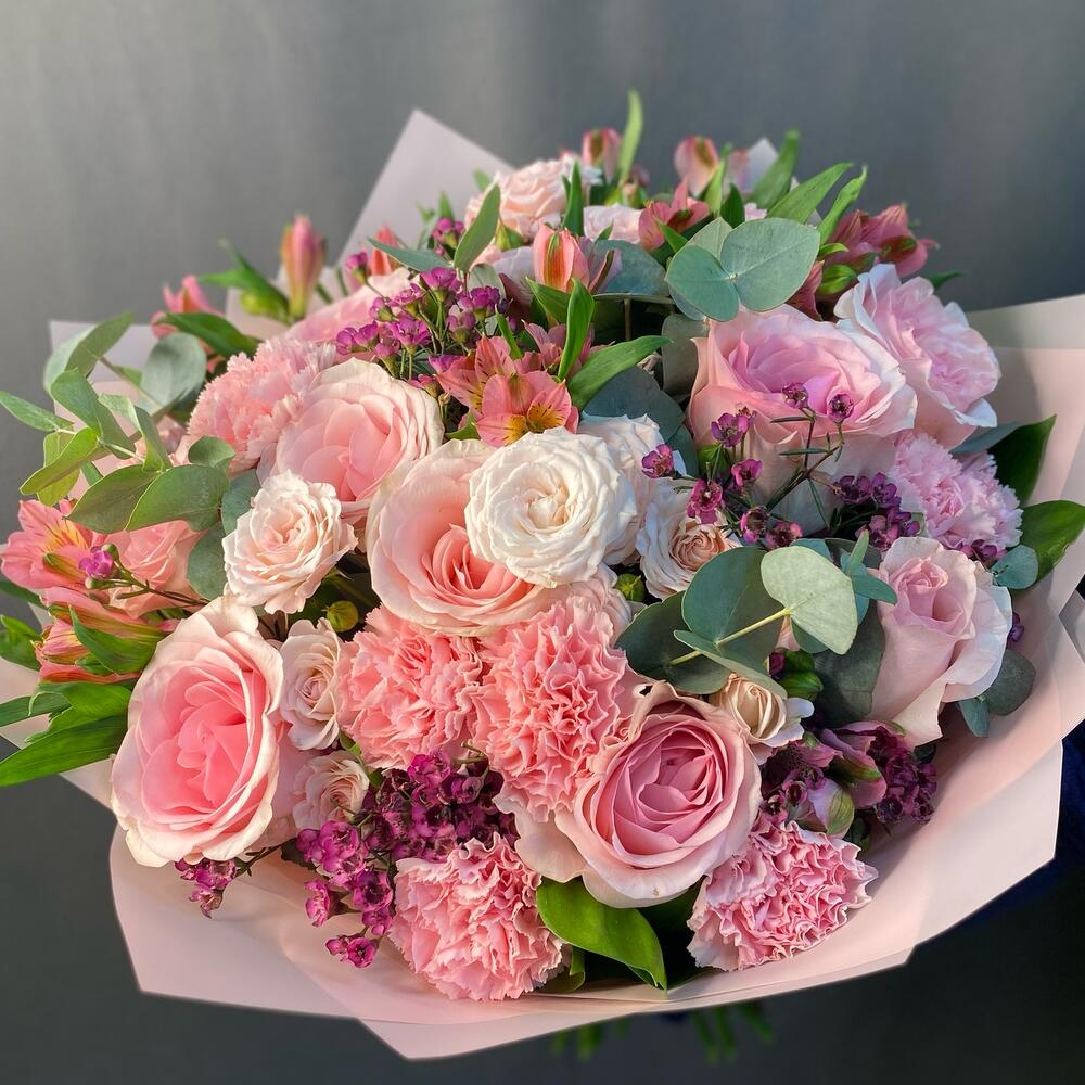 Гвоздики, Лизиантусы, Розы, Тюльпаны