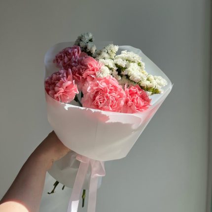 Невероятной стойкий букет с необычными гвоздиками и белыми веточками статица будет долго радовать и удивлять свою получательницу
