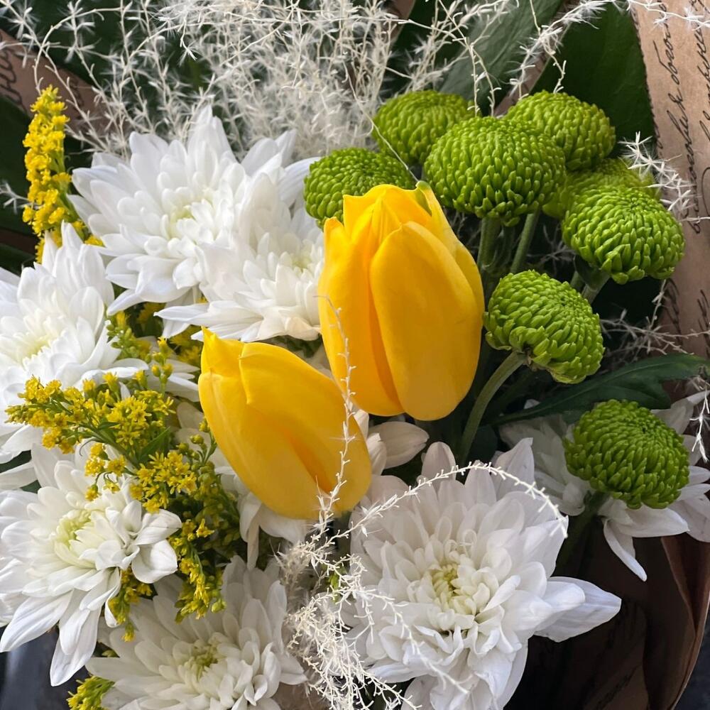 Монстера – 1 шт.Солидаго – 2 шт.Тюльпан – 3 шт.Лента атласная – 1 шт.Хризантема зеленая – 1 шт.Упаковка дизайнерская – 1 шт.хризантема куст белая – 2 шт.пампас белый – 2 шт.
