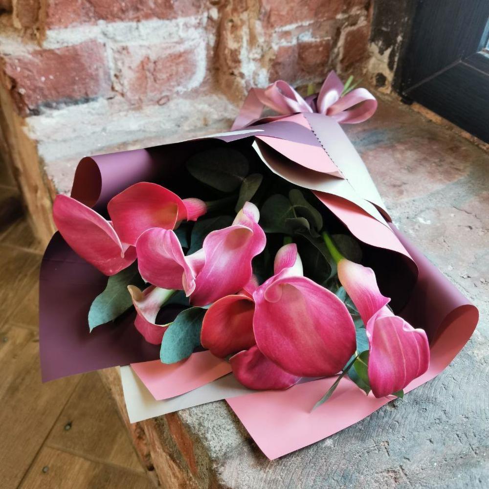 Букет из 9 розовых калл с эвкалиптом
