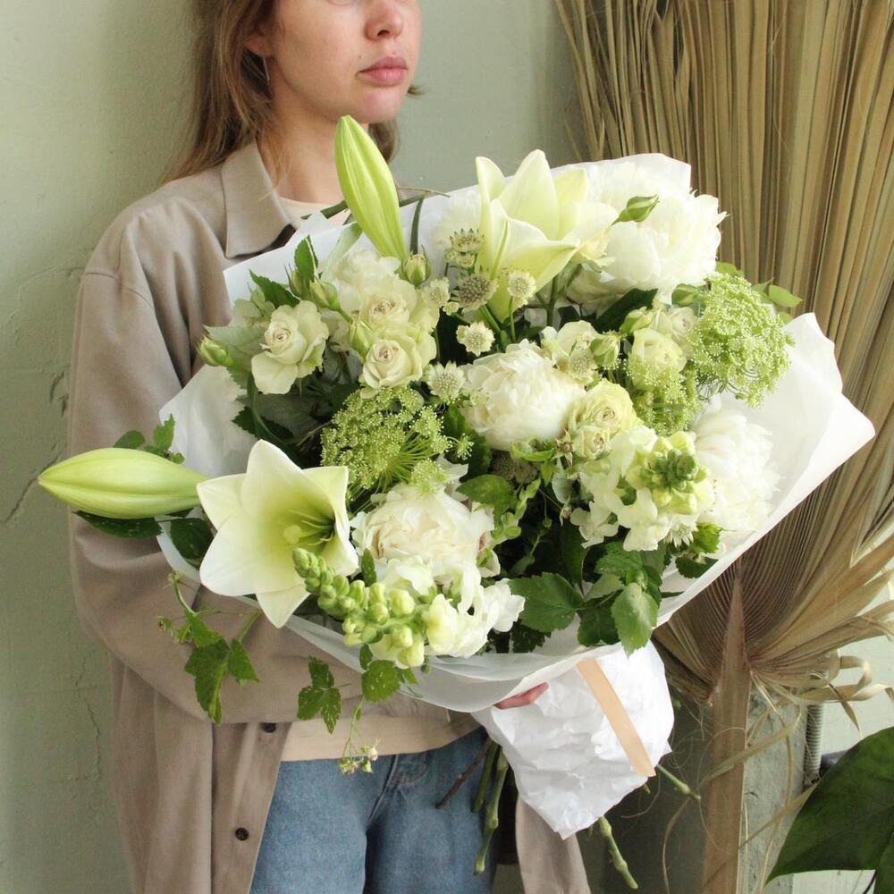Лилия лонги – 2 шт.Амми – 3 шт.Лизиантус – 3 шт.Львиный зев – 3 шт.Ветки малины – 4 шт.Фисташка – 2 шт.Астранция – 2 шт.Упаковка – 1 шт.Лента атласная – 1 шт.Пион – 3 шт.