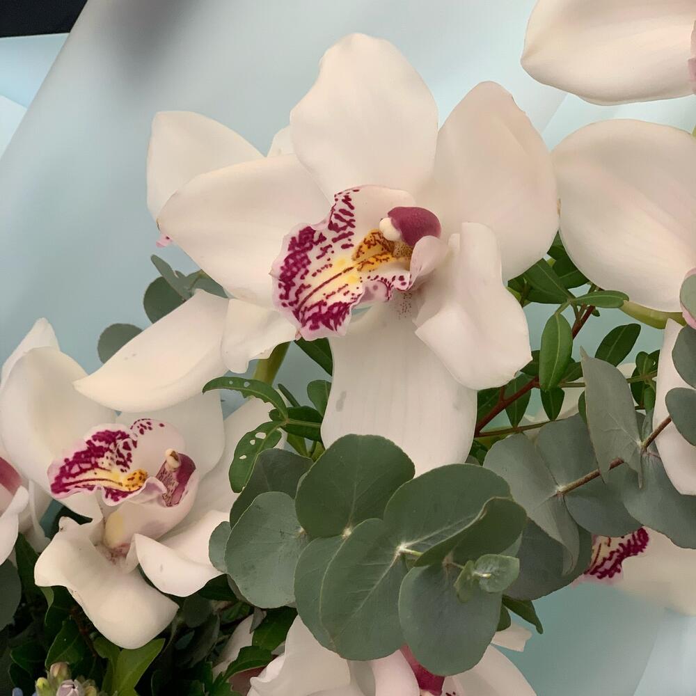 орхидея – 1 шт.Твидия – 3 шт.Дизайнерская упаковка – 3 шт.Эвкалипт – 1 шт.Зелень – 2 шт.