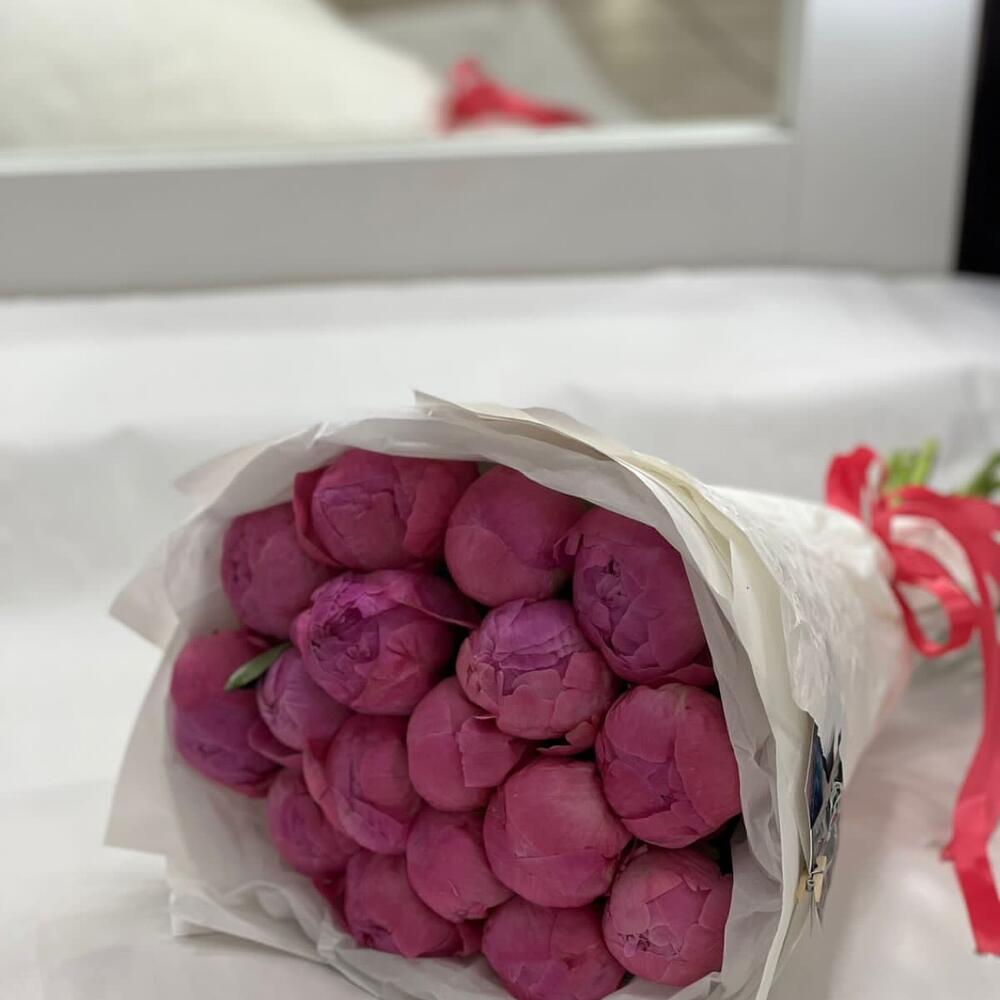 Упаковка – 2 шт.Лента атласная – 1 шт.пион ярко розовый премиум – 17 шт.