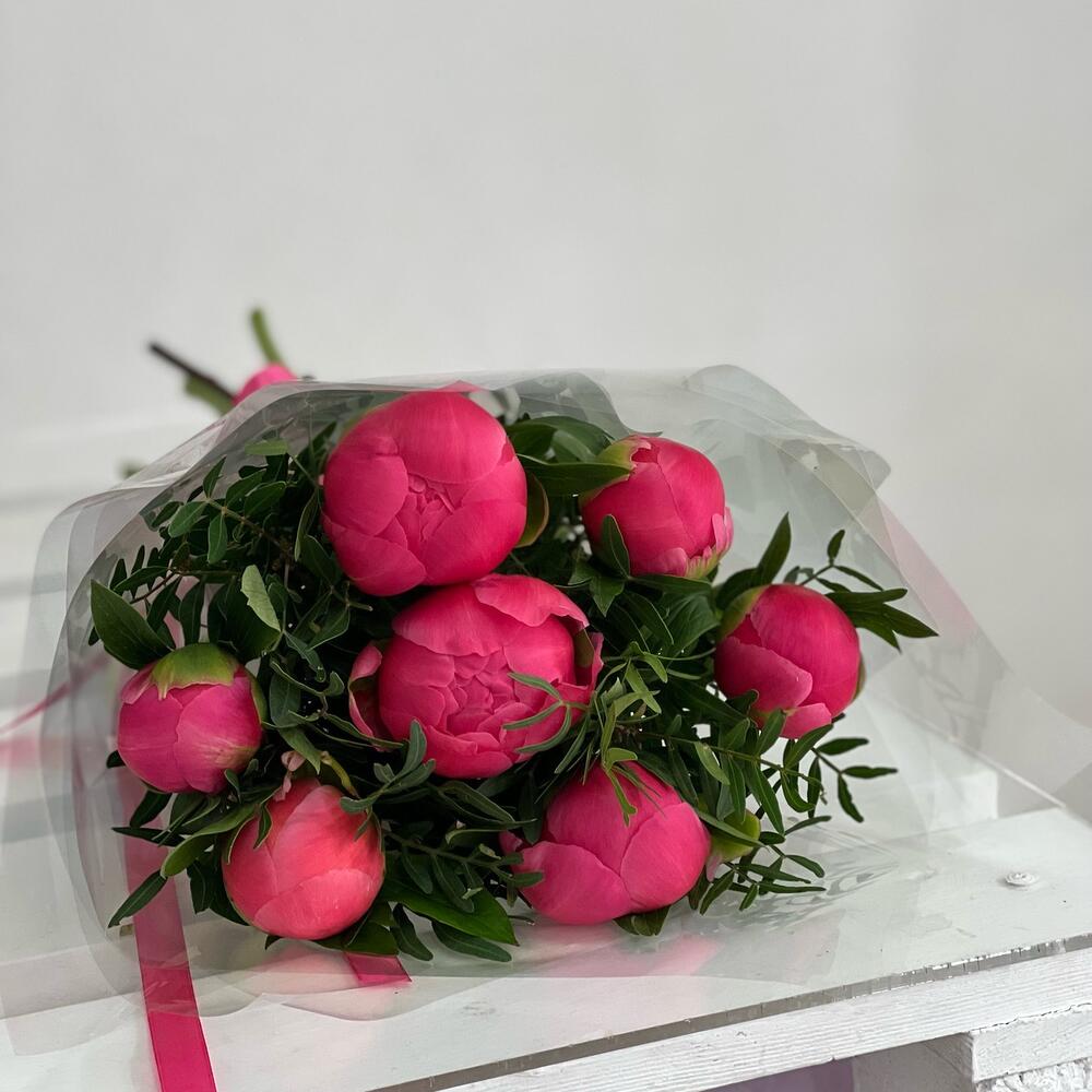 Пион Коралл Шарм (Coral Charm) – 7 шт.Лента атласная – 1 шт.Пленка прозрачная – 1 шт.фисташка зелень – 3 шт.