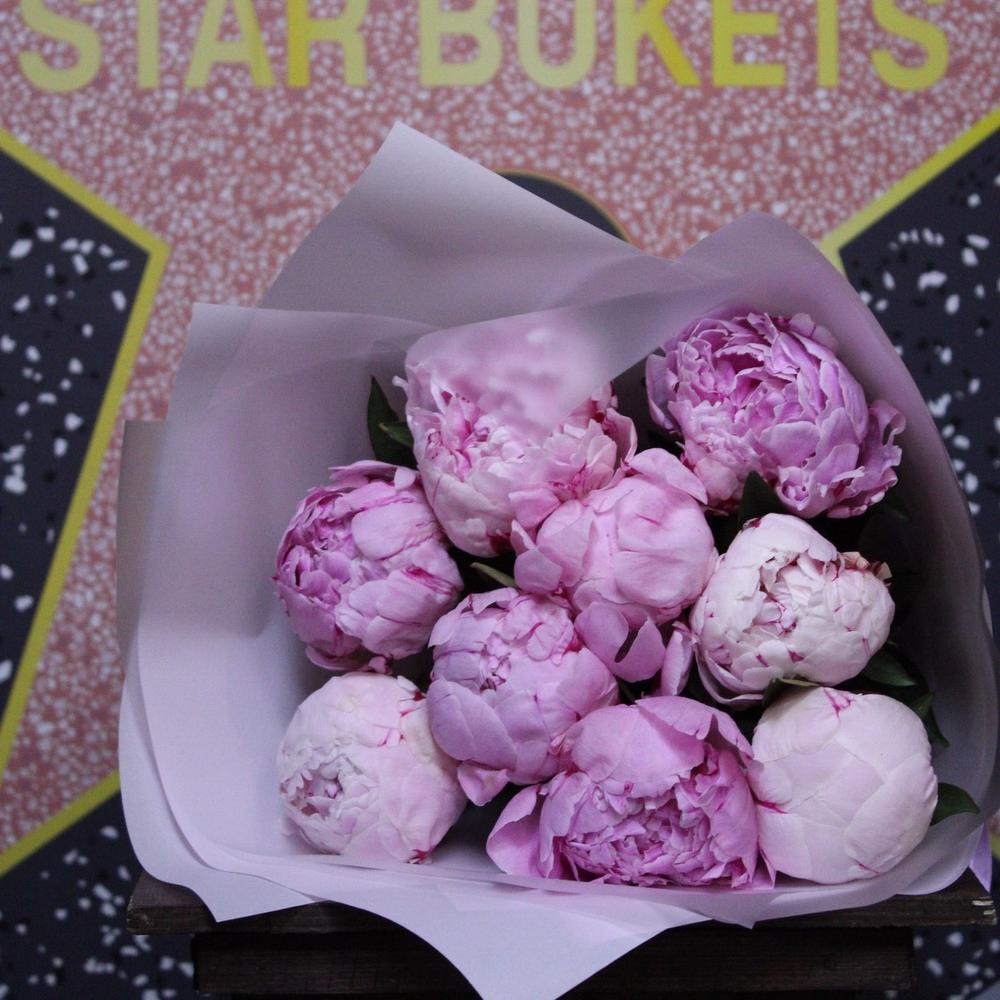 Лента атласная – 1 шт.Пион Сара Бернар – 9 шт.Пленка дизайнерская – 3 шт.