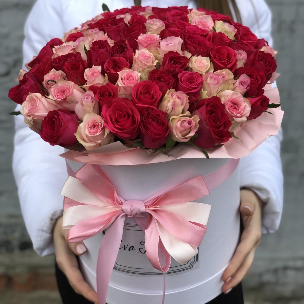 Роза Кенийская – 101 шт.Шляпная коробка – 1 шт.Оазис флористический – 2 шт.Декор лентами – 1 шт.