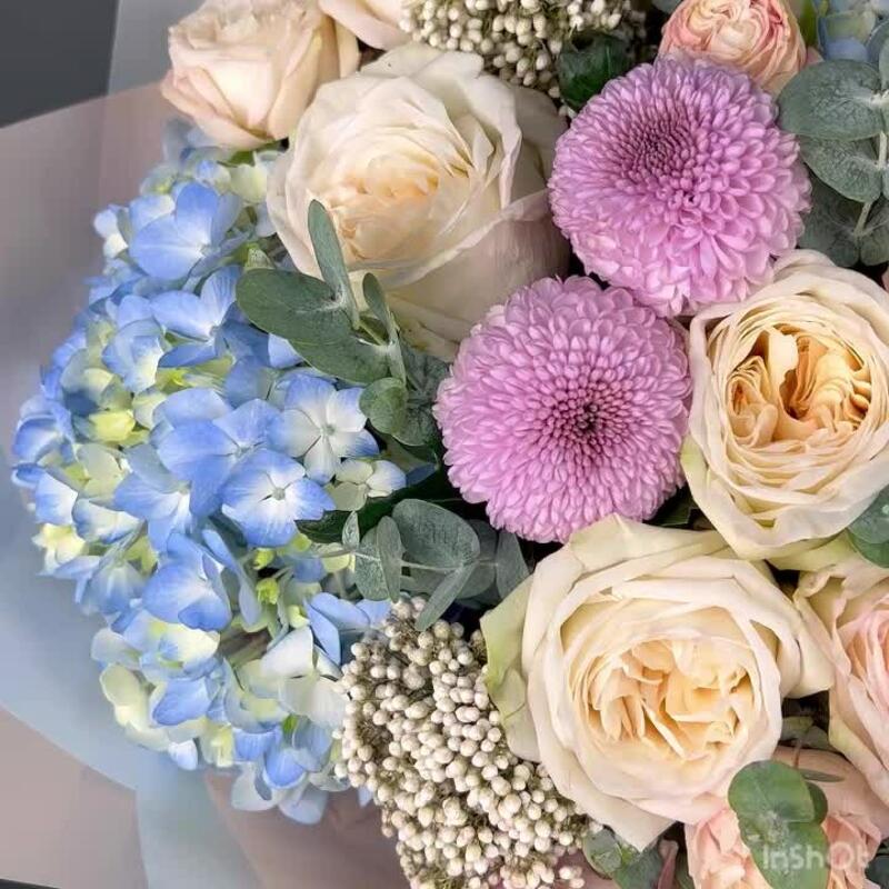 Авторский букет из голубой Гортензии, пионовидных Роз и Хризантемы Момоко