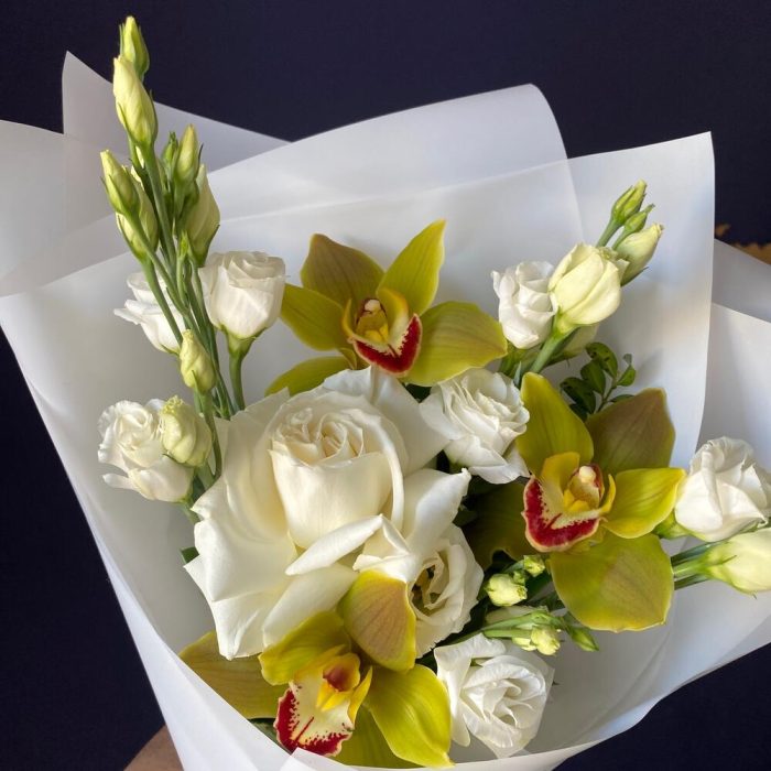 Орхидея Цимбидиум – 3 шт.Роза французская – 1 шт.Зелень – 1 шт.Лизиантус – 5 шт.Матовая пленка – 4 шт.Лента атласная – 1 шт.