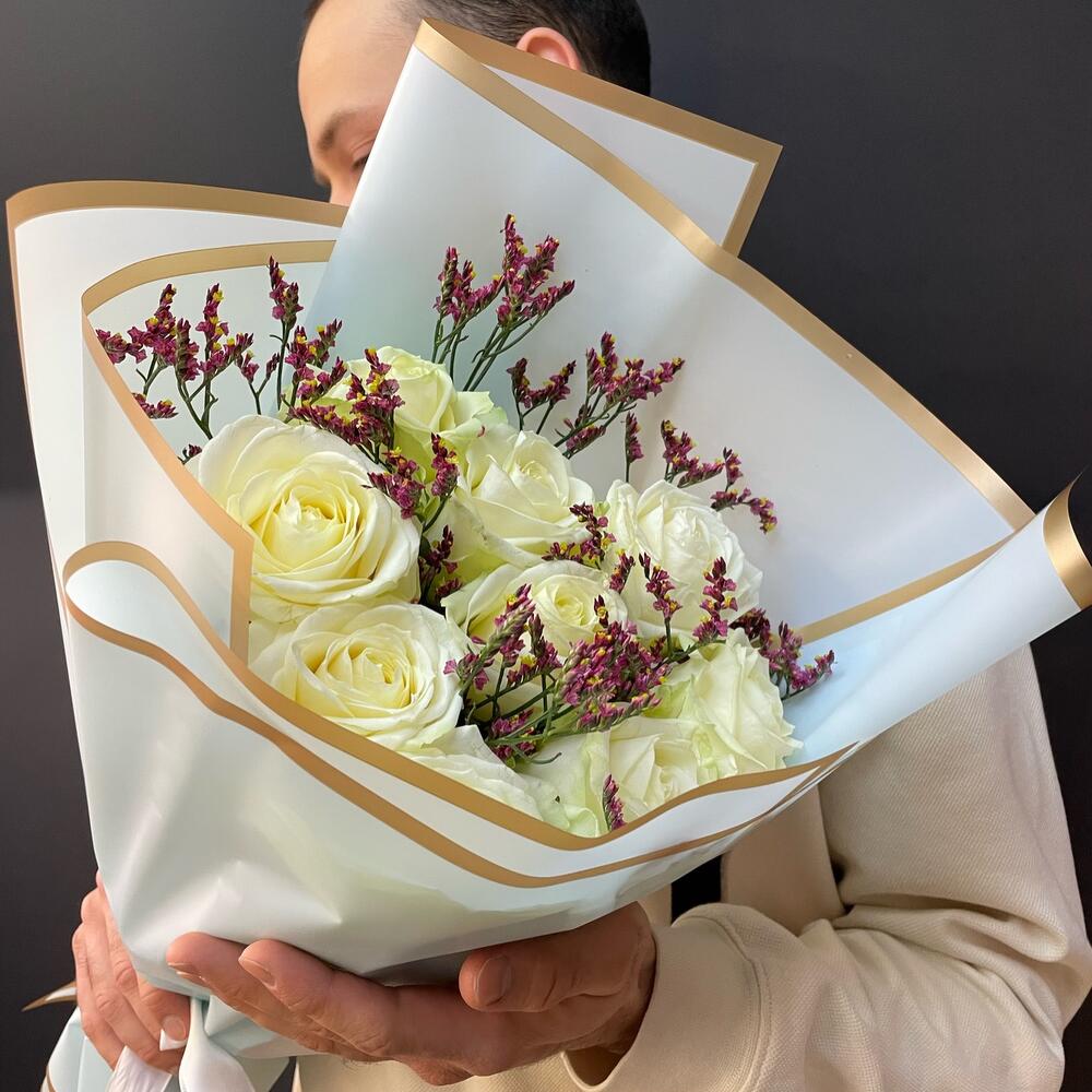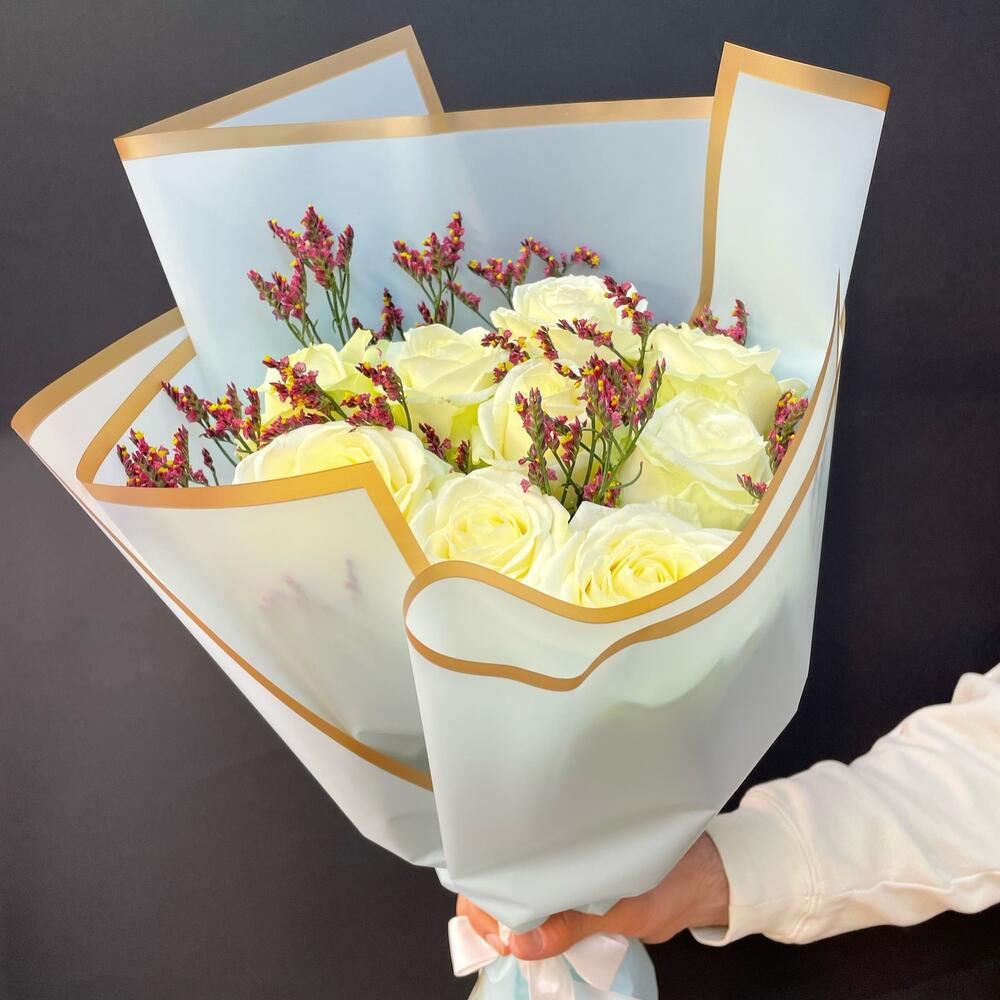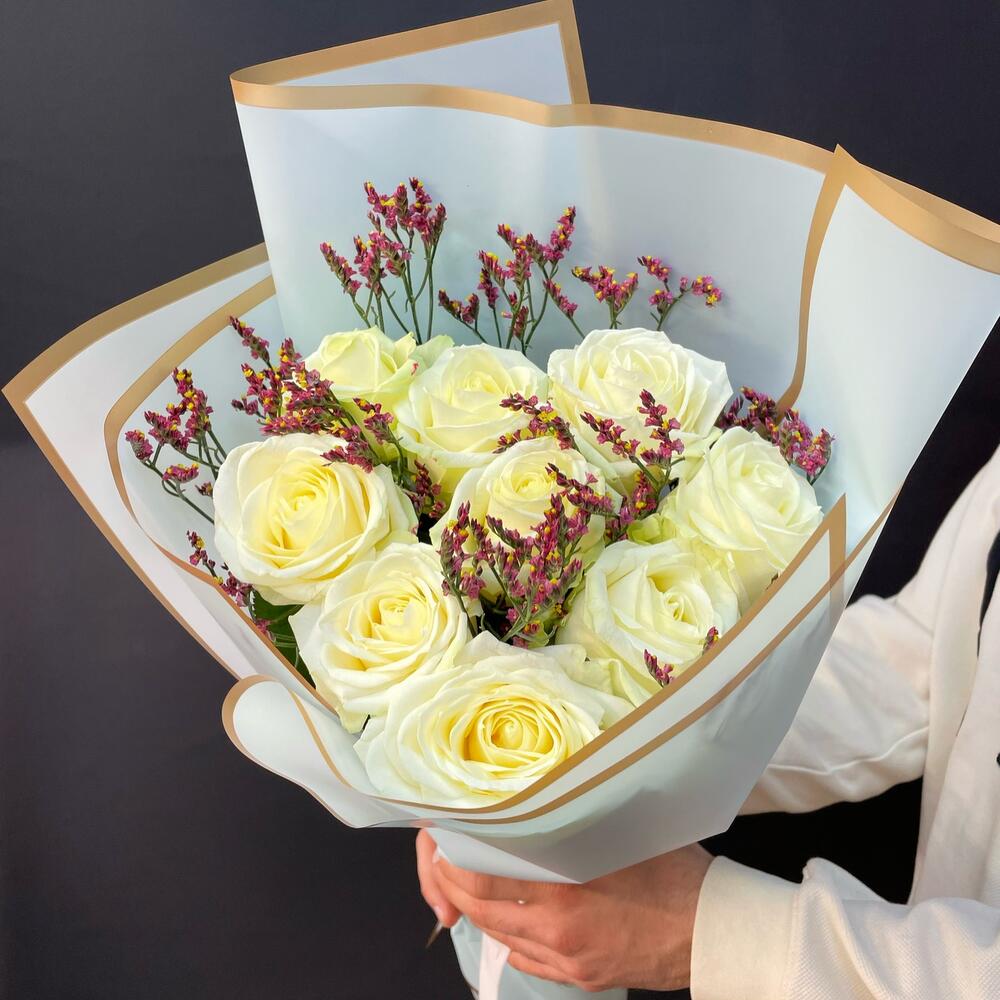 Белая роза 50 см – 9 шт.Лимониум – 1 шт.Упаковка дизайнерская – 1 шт.Лента атласная – 1 шт.