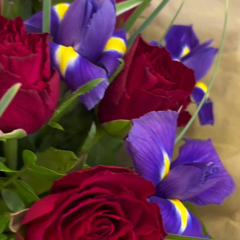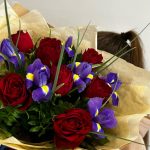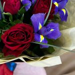 Букет из красных роз и фиолетовых ирисов