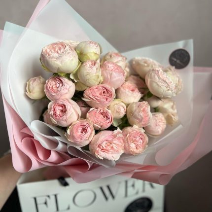 Пион – 3 шт.Трахелиум – 3 шт.Роза кустовая – 1 шт.Гвоздика – 3 шт.Эустома – 1 шт.Лента – 2 шт.Фисташка – 3 шт.Твидия – 2 шт.Упаковка – 2 шт.Хризантема кустовая – 2 шт.Лилия махровая – 1 шт.
