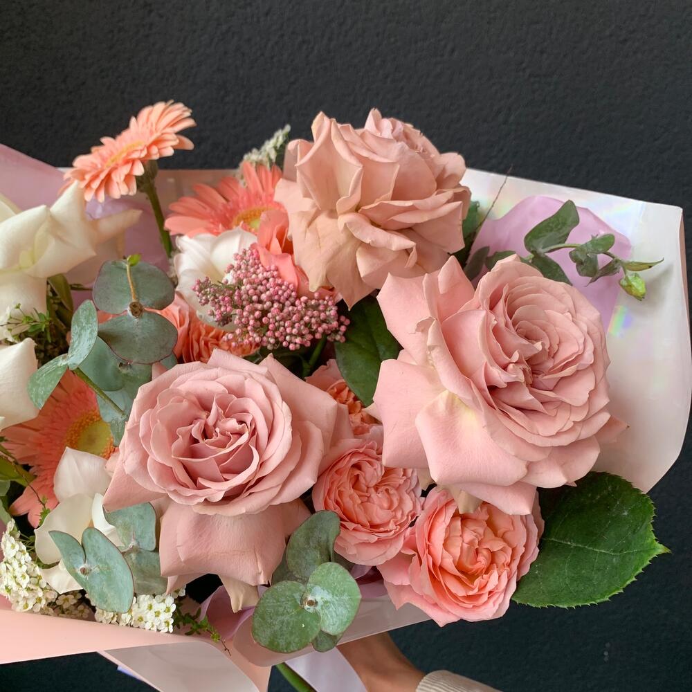 Пионовидная роза – 6 шт.Гербера – 3 шт.Тюльпан – 3 шт.Кустовая роза – 2 шт.Озотамнус – 1 шт.Эвкалипт – 3 шт.декоративная упаковка – 1 шт.Атласная лента – 1 шт.