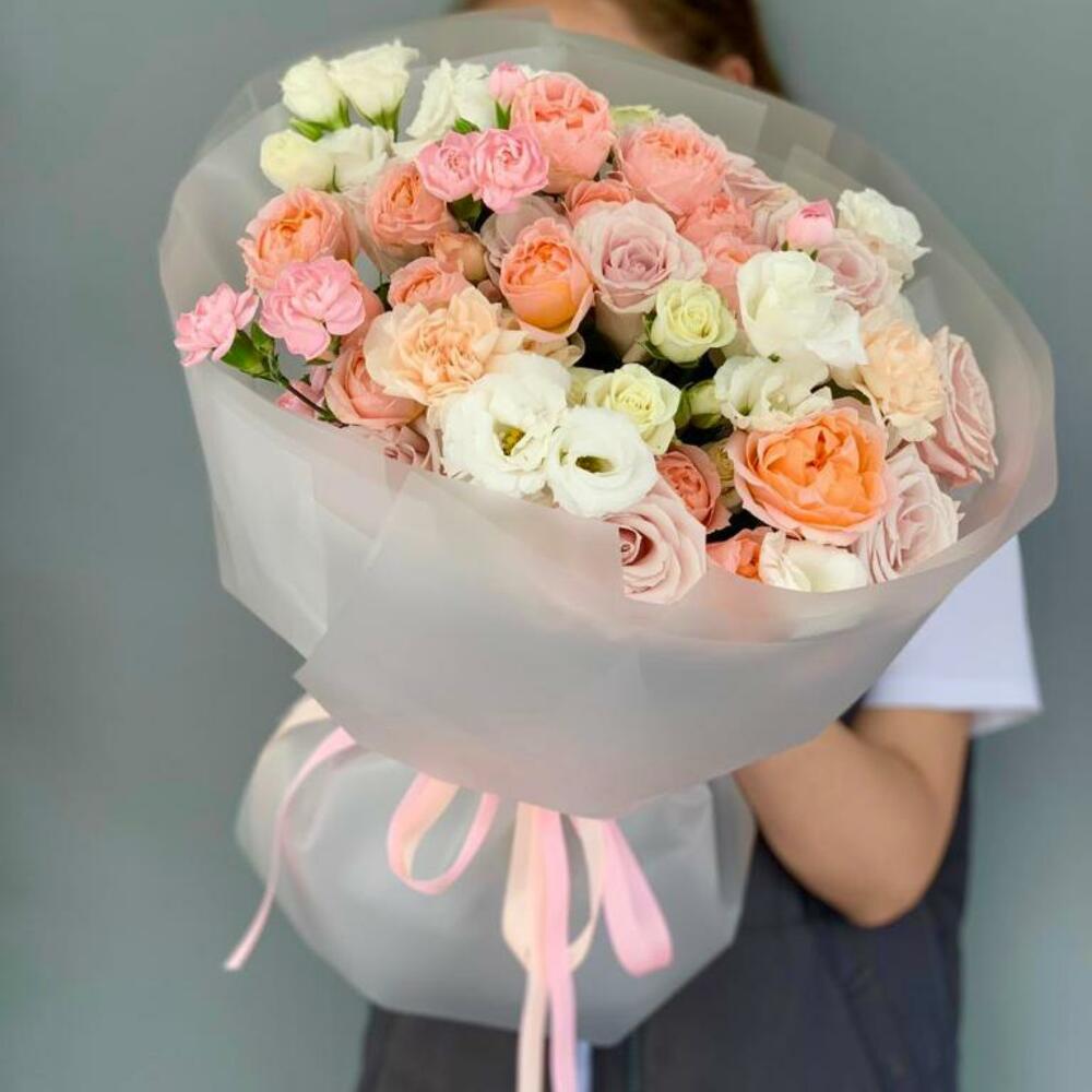 Альстромерии, Гвоздики, Кустовые розы, Лизиантусы, Розы, Хризантемы