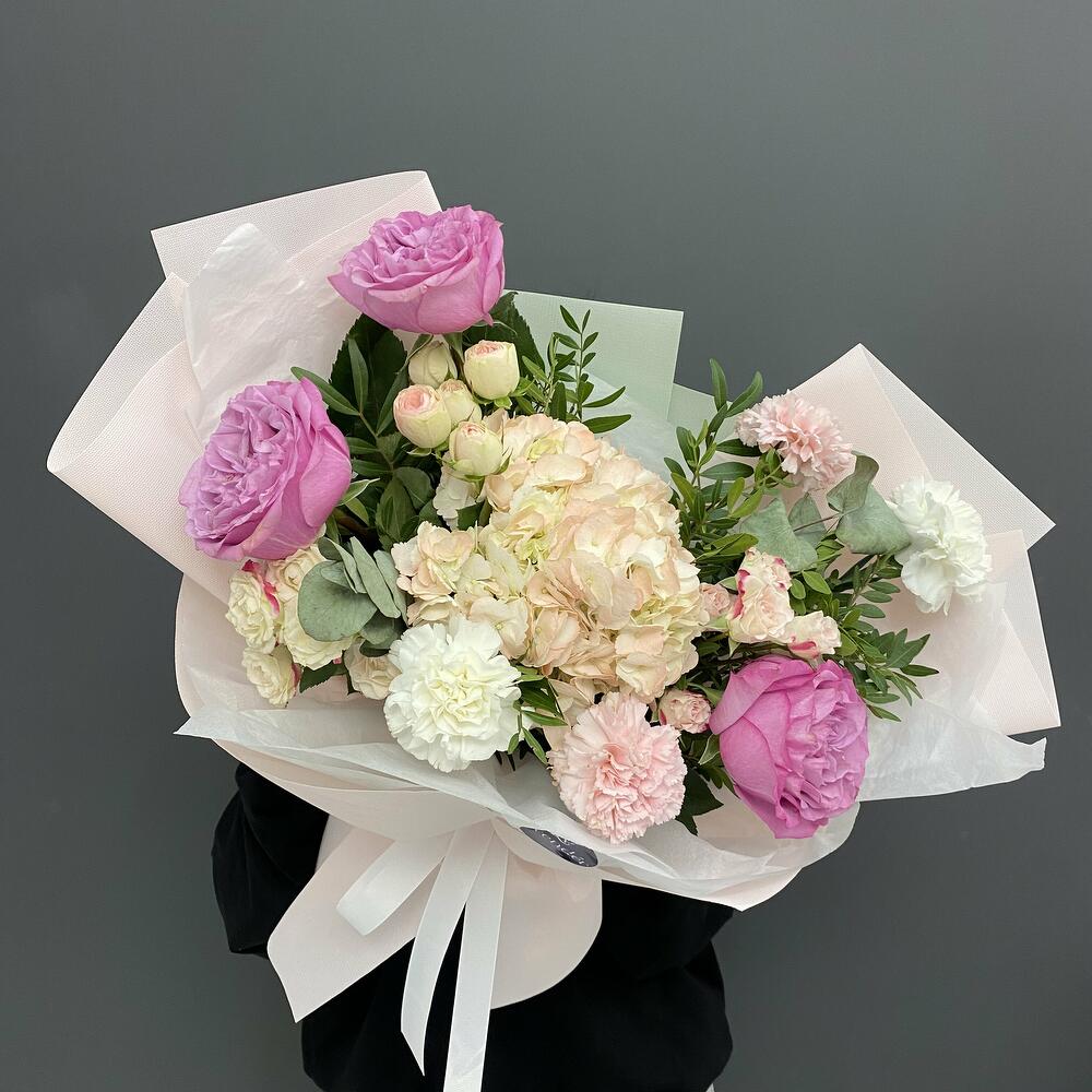 Гвоздики, Кустовые розы, Пионовидные розы, Розы