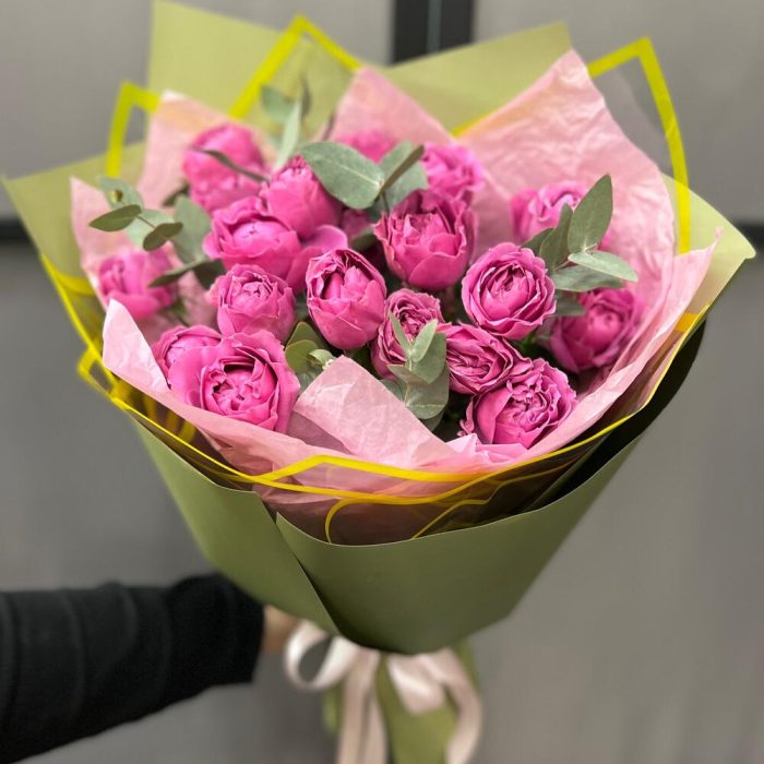 Эвкалипт – 3 шт.Лента атласная – 2 шт.Тишью – 2 шт.Пленка матовая – 4 шт.роза кустовая мисти бабл – 5 шт.пленка дизайнесркая с каймой – 2 шт.
