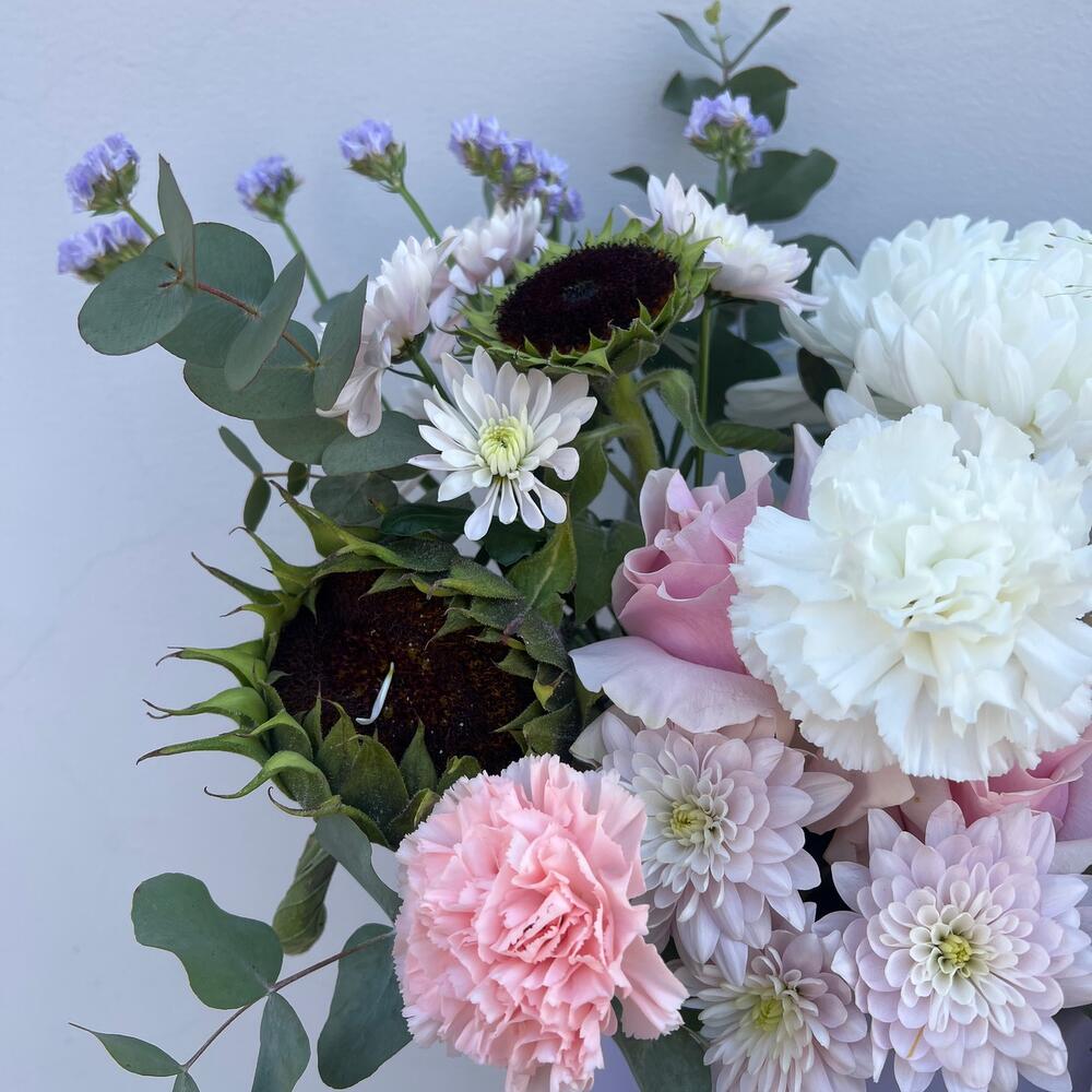 Хризантема Антонов – 1 шт.Диантус – 6 шт.Роза французская – 2 шт.Подсолнух – 2 шт.Паникум – 2 шт.Хризантема Балтика – 1 шт.Статица – 1 шт.Эвкалипт – 1 шт.Оазис флористический – 1 шт.Коробка шляпная – 1 шт.