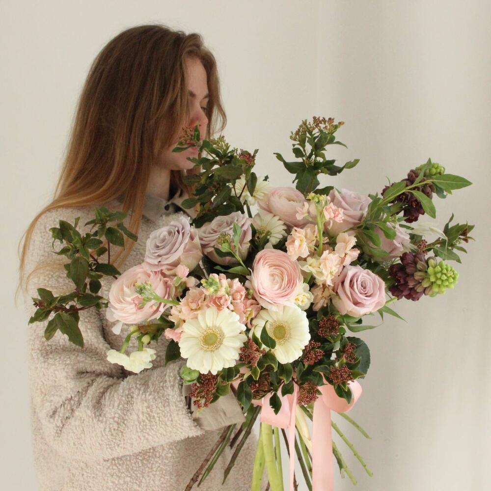 Ранункулюс – 3 шт.Роза сортовая – 5 шт.Гербера – 4 шт.Нарцисс кустовой – 3 шт.Маттиола – 3 шт.вибурнум цветущий – 5 шт.Лента атласная – 1 шт.