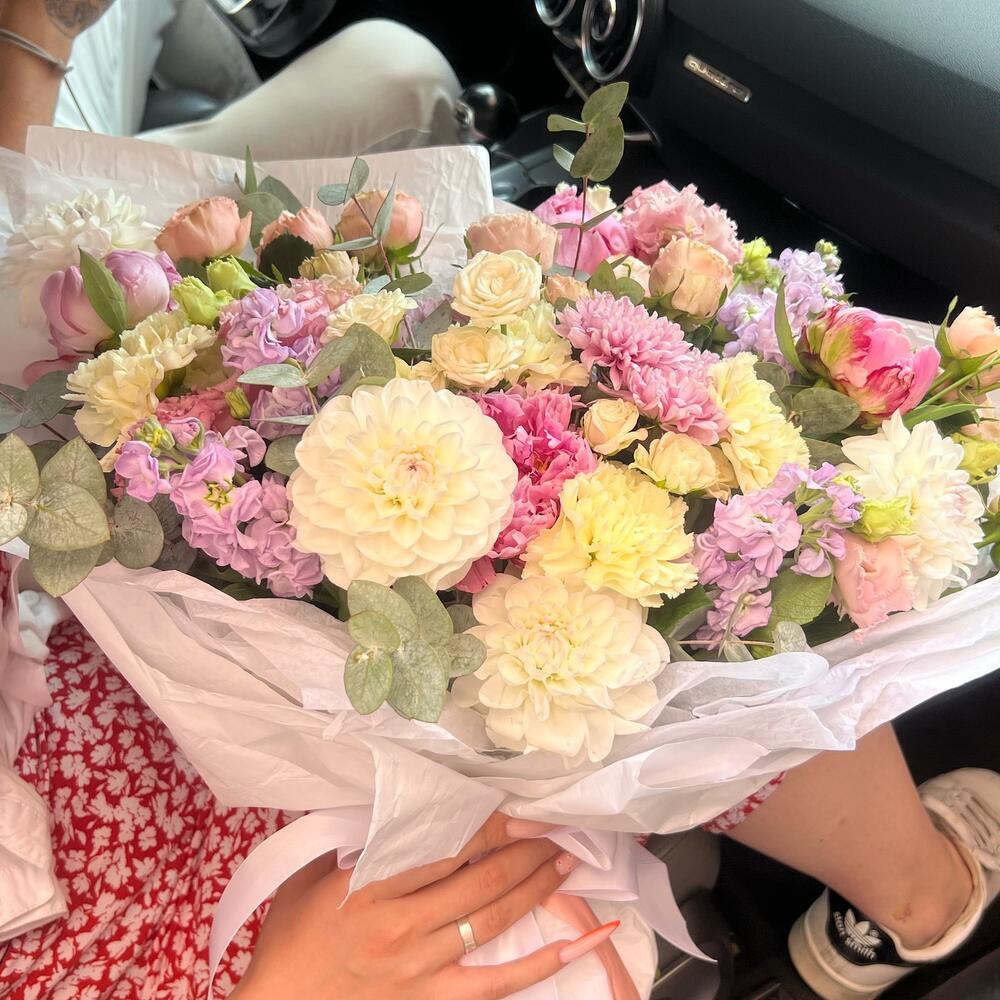 пионы сара бернар – 4 шт.Маттиола лавандовая – 4 шт.Лизиантус – 2 шт.Георгина белый – 4 шт.Диантус – 4 шт.Эвкалипт Синерия – 7 шт.Кустовая роза – 3 шт.Хризантема кустовая – 3 шт.Упаковка дизайнерская – 3 шт.Лента атласная – 2 шт.