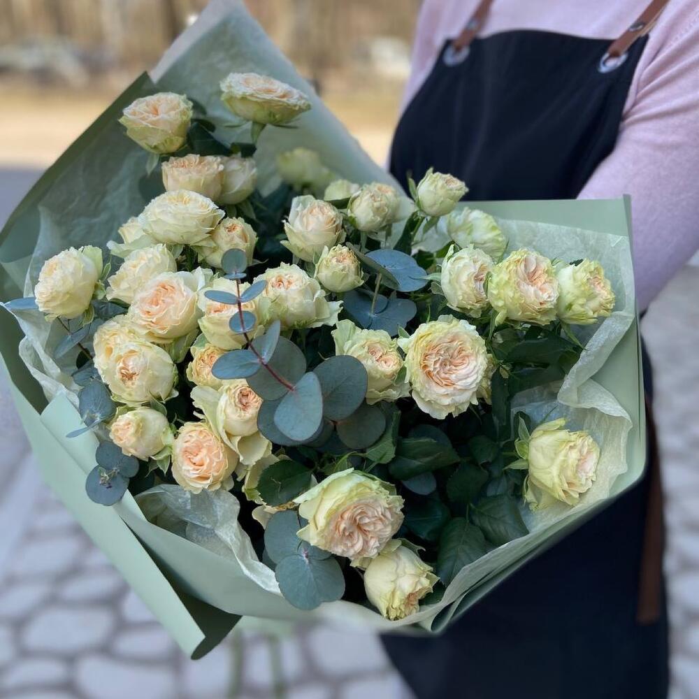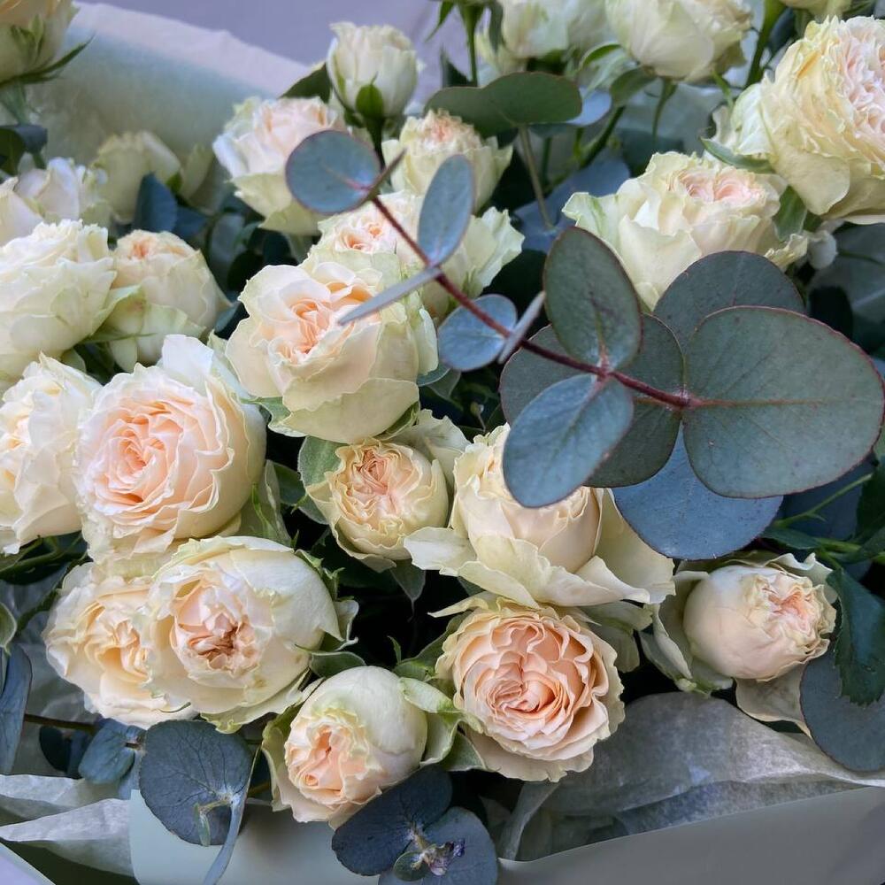 Эвкалипт – 3 шт.Лента атласная – 1 шт.Роза кустовая пионовидная – 7 шт.Упаковка дизайнерская – 6 шт.