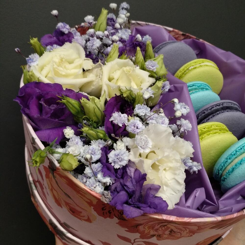 “Атлас☁️” – цветочная композиция с зефиром в деревянном ящике