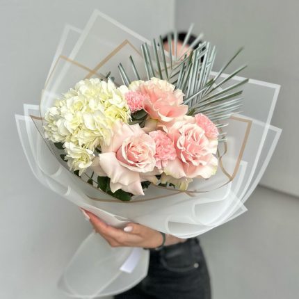 Альстромерия – 3 шт.Калла – 3 шт.Лизиантус – 2 шт.Озотамнус – 4 шт.Роза кустовая – 4 шт.Салал – 3 шт.Упаковка – 5 шт.Диантус – 7 шт.Сантини – 9 шт.Фисташка – 3 шт.Роза пионовидная – 5 шт.Гринбелл – 2 шт.