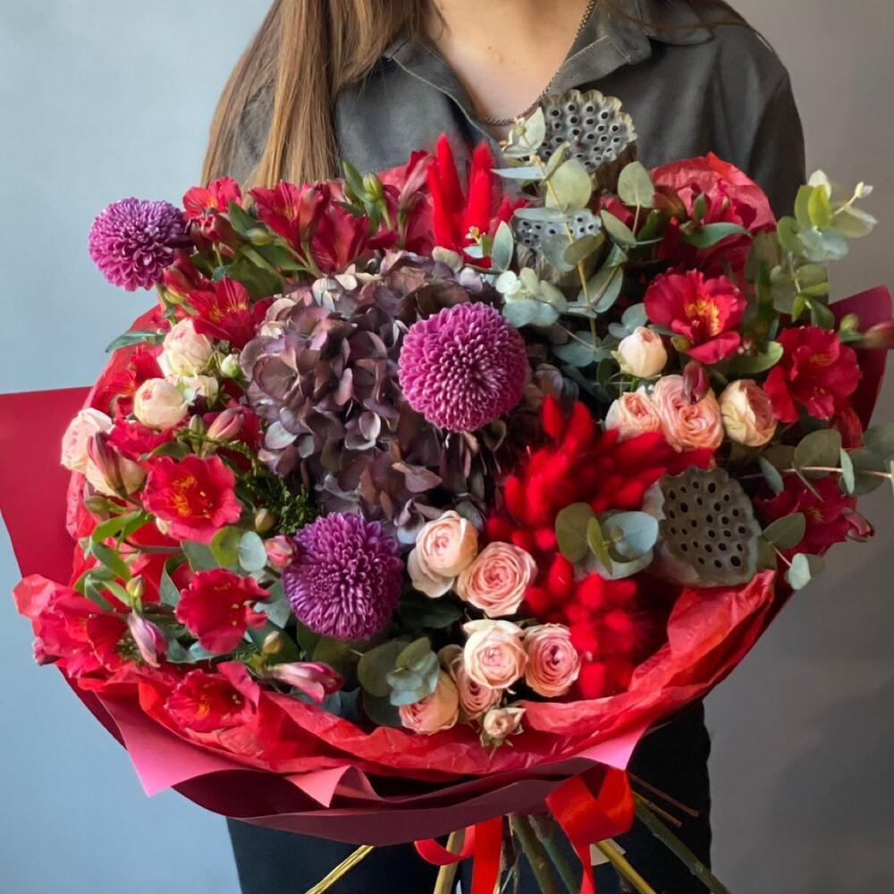 Категорий: Альстромерии, Гортензии, Кустовые розы, Розы, Сухоцвет, Хризантемы
