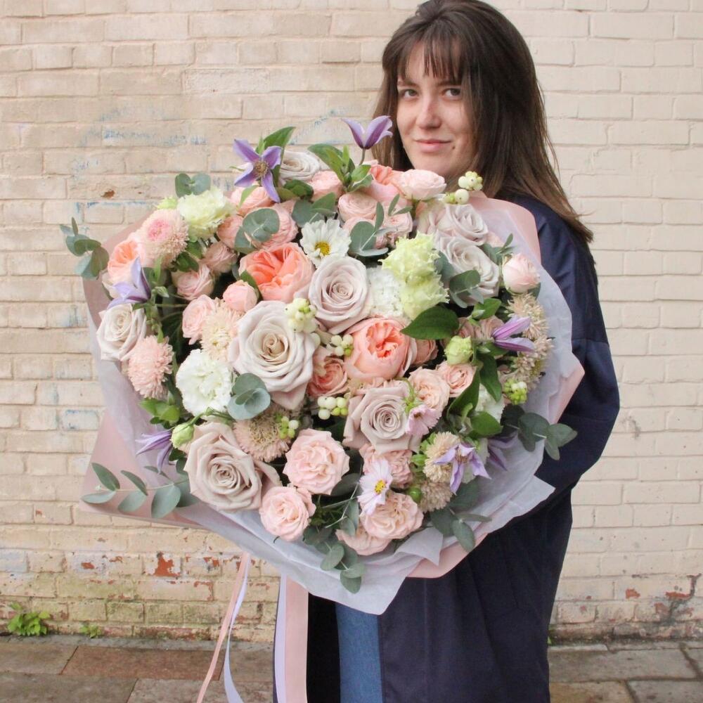 Садовый букет с пионовидными розами, клематисом и эустомой