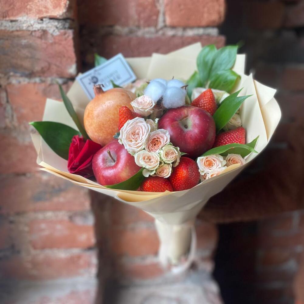 Съедобный букет с розами, клубникой и фруктами “Наливное яблочко”