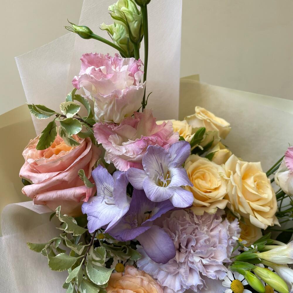 Гвоздики, Лизиантусы, Розы, Тюльпаны