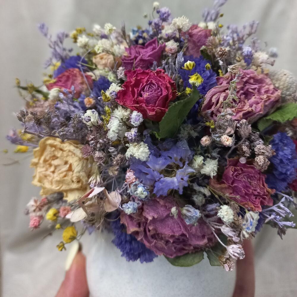 Роза сухоцвет – 13 шт.бруния сухоцвет – 1 шт.гипсофила сухоцвет радужная – 3 шт.статица сухоцвет – 2 шт.Сухоцветы – 10 шт.зелень сухоцвет ассорти – 7 шт.Эвкалипт – 1 шт.вазочка керамическая – 1 шт.