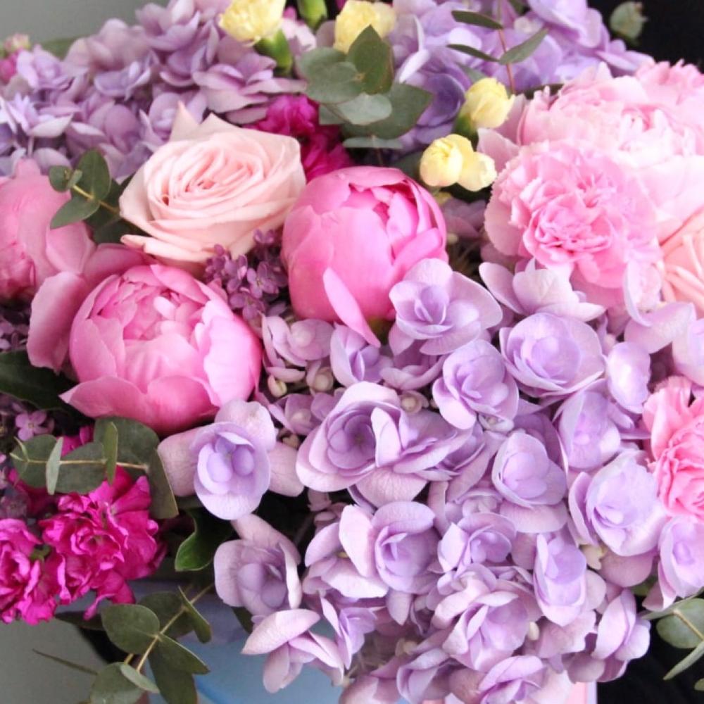 Гортензия – 3 шт.Пионовидная роза – 6 шт.Роза пионовидная – 5 шт.Маттиола – 4 шт.Гвоздика – 9 шт.Эвкалипт – 7 шт.Шляпная коробка – 1 шт.Лента атласная – 2 шт.Оазис флористический – 1 шт.
