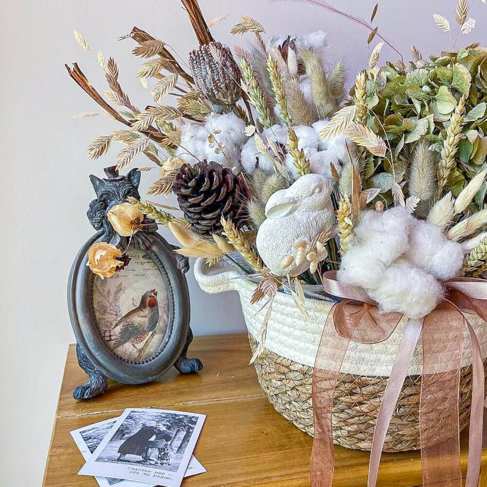 Гортензия – 1 шт.Хлопок натуральный – 7 шт.Физалис – 1 шт.Лагурус – 25 шт.Банксия – 1 шт.Пшеница – 20 шт.