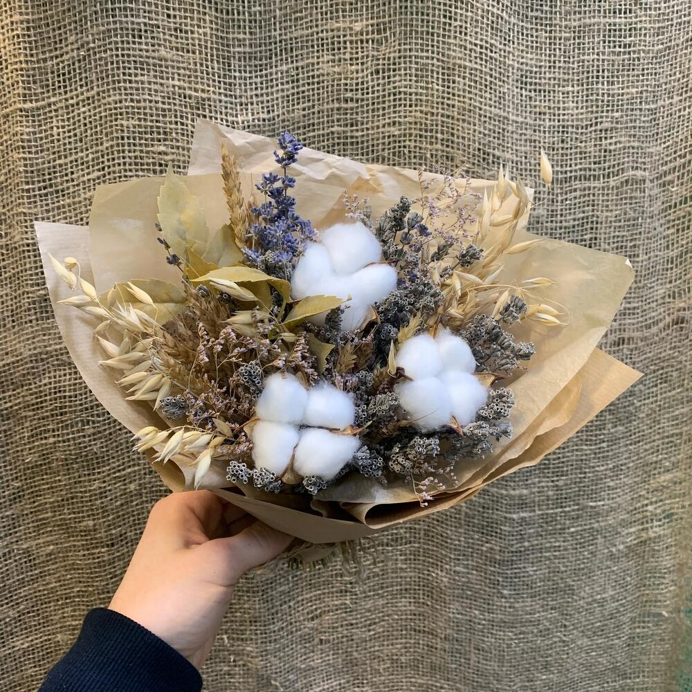 Лимониум – 1 шт.Тишью – 1 шт.Пшеница (сухоцвет) – 17 шт.бечевка натуральная – 1 шт.овес сухоцвет – 7 шт.хлопок белый – 3 шт.лаванда крымская – 1 шт.крафт натуральный – 1 шт.листья искуственные – 2 шт.лаванда садовая – 1 шт.