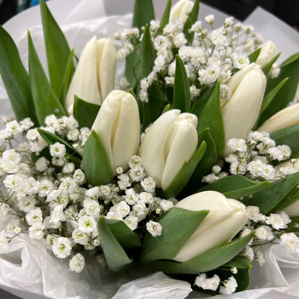 Тюльпан белый – 9 шт.Гипсофила – 2 шт.Тишью белое – 2 шт.Пленка матовая – 5 шт.Лента атласная – 2 шт.